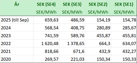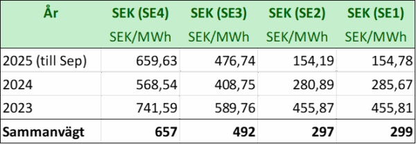 Intäkterna från elproduktion var omkring 43 öre per kWh (Sverige SE 3) i maj 2025 och beräknades vara ca 45 öre per kWh för kostnadskalkylen som ett genomsnitt för de senaste tre åren.