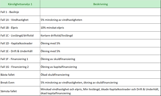 Vindkraftpark/utformning 1 har lägre navhöjd, 100 m istället för 150 m, och får då en lägre medelvind på 7,4 m/s vilket också ger en lägre elproduktion. Beräkningen av inkomster och utgifter visar att denna vindkraftspark har svårt att bli lönsam.