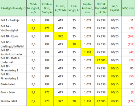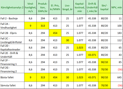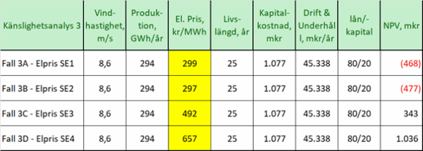 Nils-Erik kommer fram till att vindkraftsparken behöver en hög elproduktion och stabila höga elpriser för att vara lönsam, se positivt NPV (Net present value eller nettonuvärde), i den ekonomiska kalkylen.