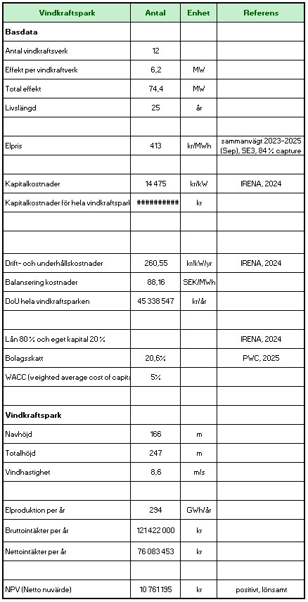 Nils-Erik kommer fram till att vindkraftsparken behöver en hög elproduktion och stabila höga elpriser för att vara lönsam, se positivt NPV (Net present value eller nettonuvärde), i den ekonomiska kalkylen.