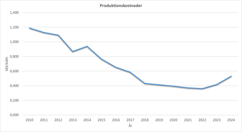 Intäkterna från elproduktion var omkring 43 öre per kWh (Sverige SE 3) i maj 2025 och beräknades vara ca 45 öre per kWh för kostnadskalkylen som ett genomsnitt för de senaste tre åren.