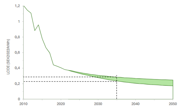 I diagrammet nedan visas historiska produktionskostnader från IRENA SEK/kWh utan balanskostnader.